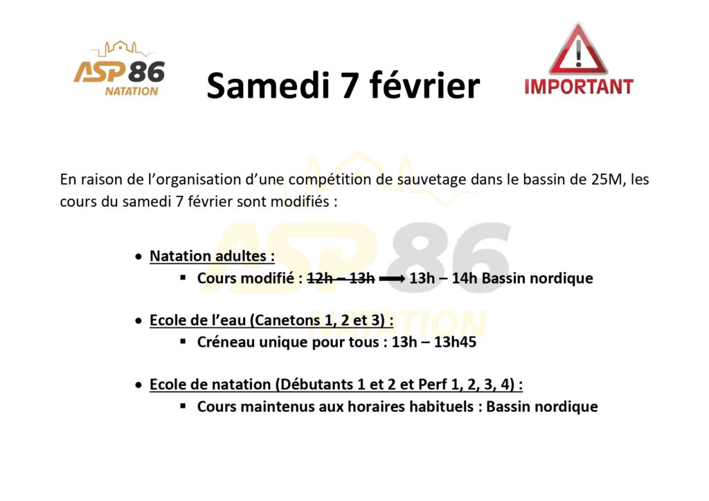 En raison de l’organisation d’une compétition de Sauvetage ce samedi 7 février à la piscine de la Ganterie, nous sommes dans l’obligation de modifier les créneaux se déroulant dans cet établissement.